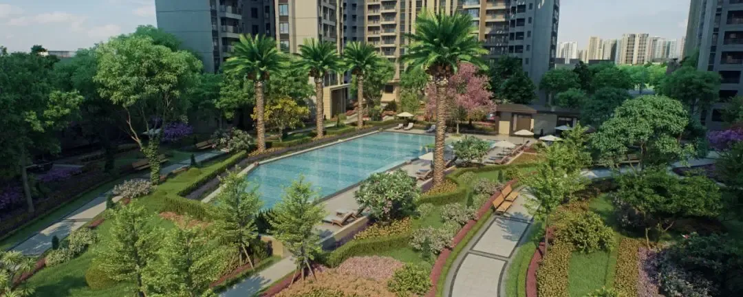 **设计亮点**:建筑采用现代都市主义风格,立面线条简洁明快,低密度庭院设计配以480㎡泳池与儿童活动场地,兼顾美学与实用性。