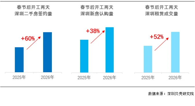 春节假期结束,伴随大批市民返深复工及人口流入,深圳楼市显著升温,新房、二手房与租赁市场全面回暖。据深圳贝壳研究院统计,今年春节后开工两天,贝壳深圳合作门店二手房签约量较去年同期增长60%,新房认购量同比增长38%,租赁成交量同比增长52%,可见深圳楼市 “开门红” 成色十足。