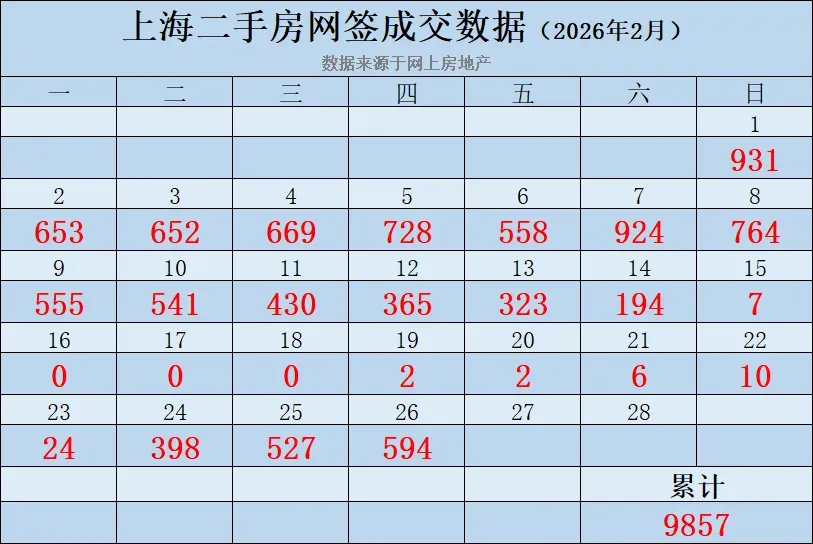 ▶ 上海2月二手房成交(统计截至2/26):2/26签约成交594套,2月二手房累计签约成交9857套(数据源自网上房地产);