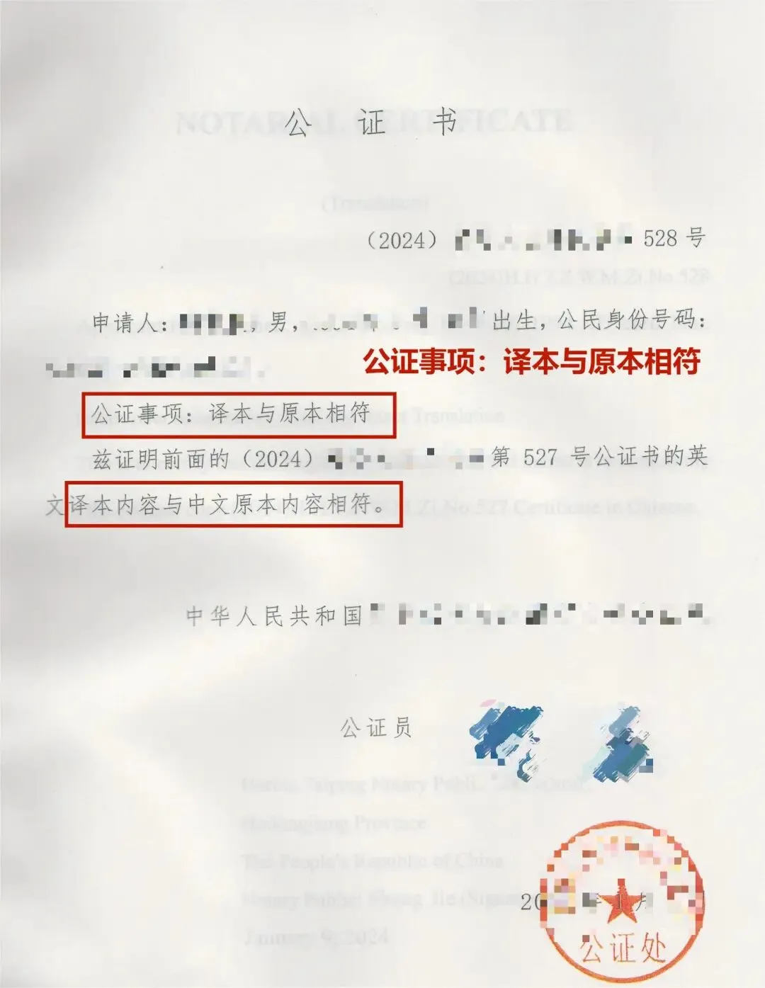 如美国要求的是双号公证,即在公证书基础上增加一页“译文与原文相符”公证词。