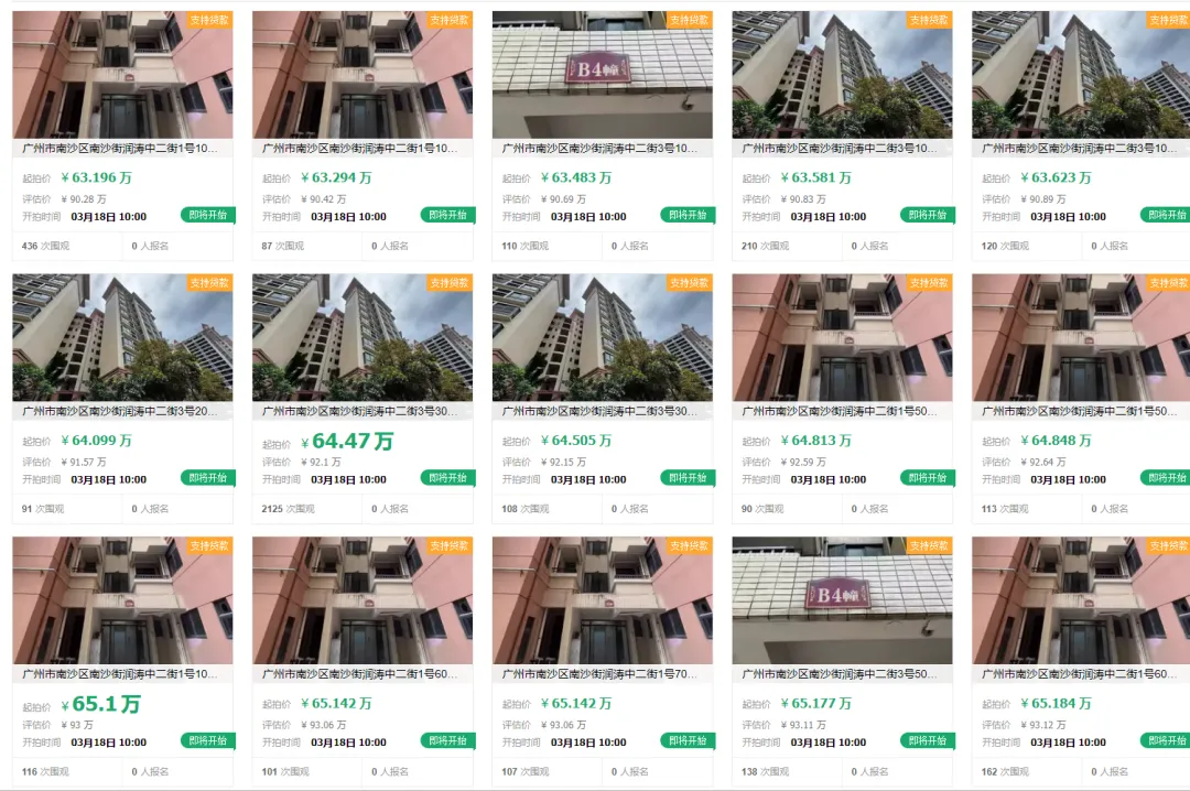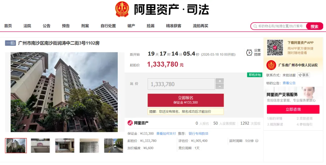 2026年3月18日10:00-2026年3月19日10:00,广东省广州市中级人民法院将在阿里资产平台对广州市南沙区南沙街润涛中二街的一批房产标的进行公开拍卖。