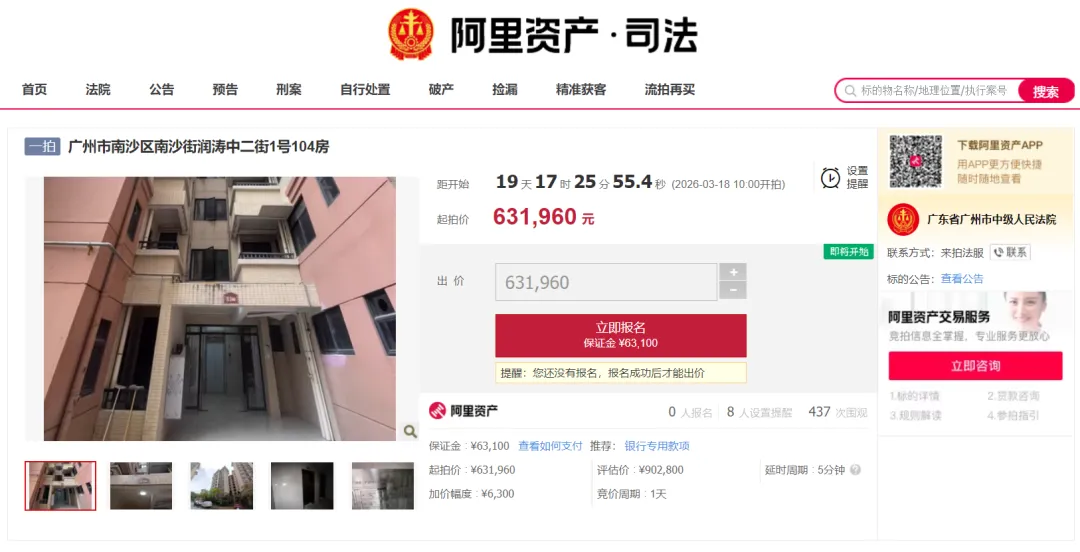 以名为“广州市南沙区南沙街润涛中二街1号104房”的标的为例,该标的为本场起拍价最低的标的。