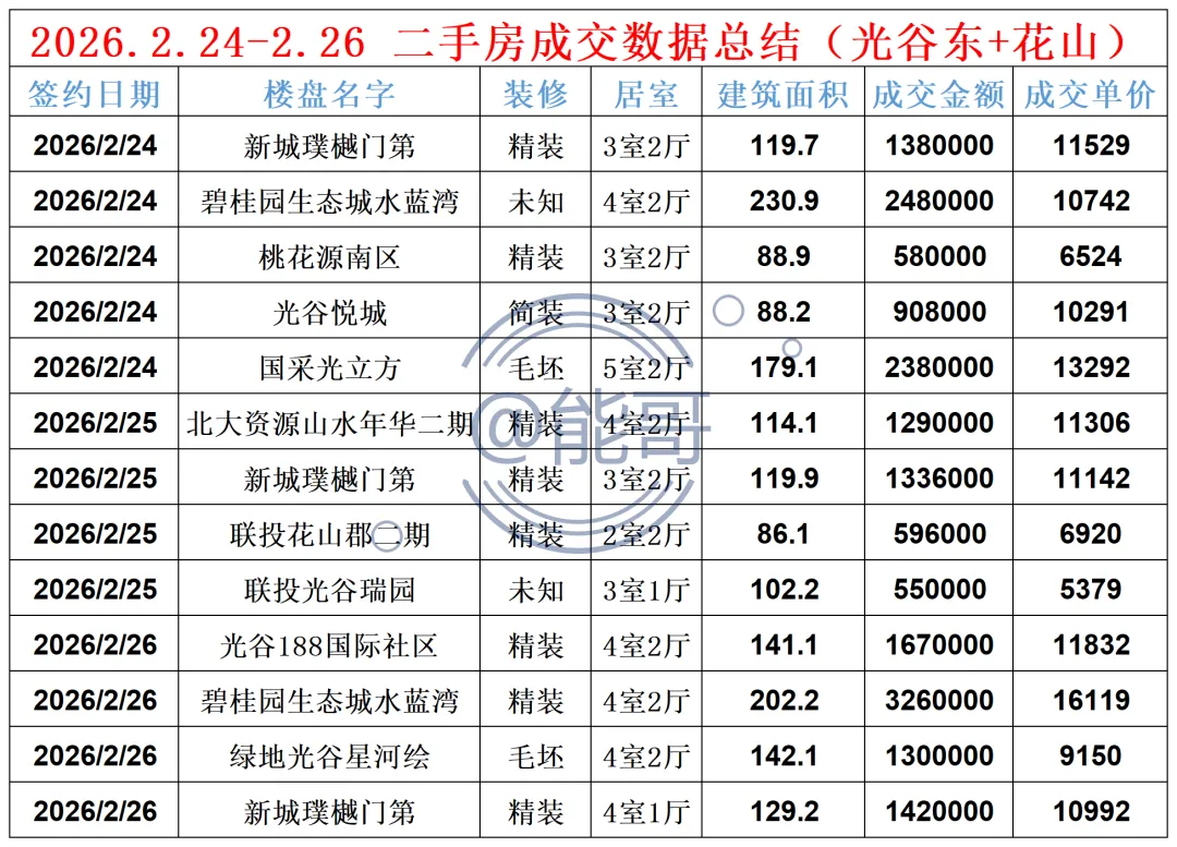 2026.2.24-2.26 二手房成交数据 (光谷东+花山)