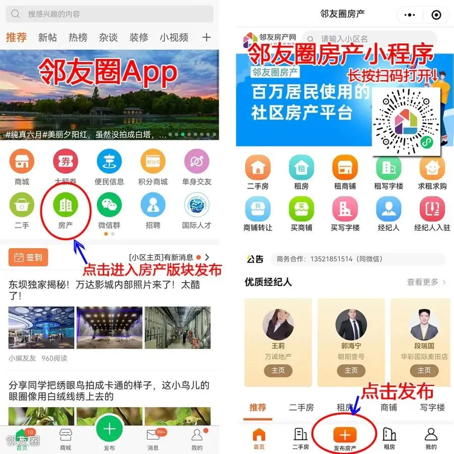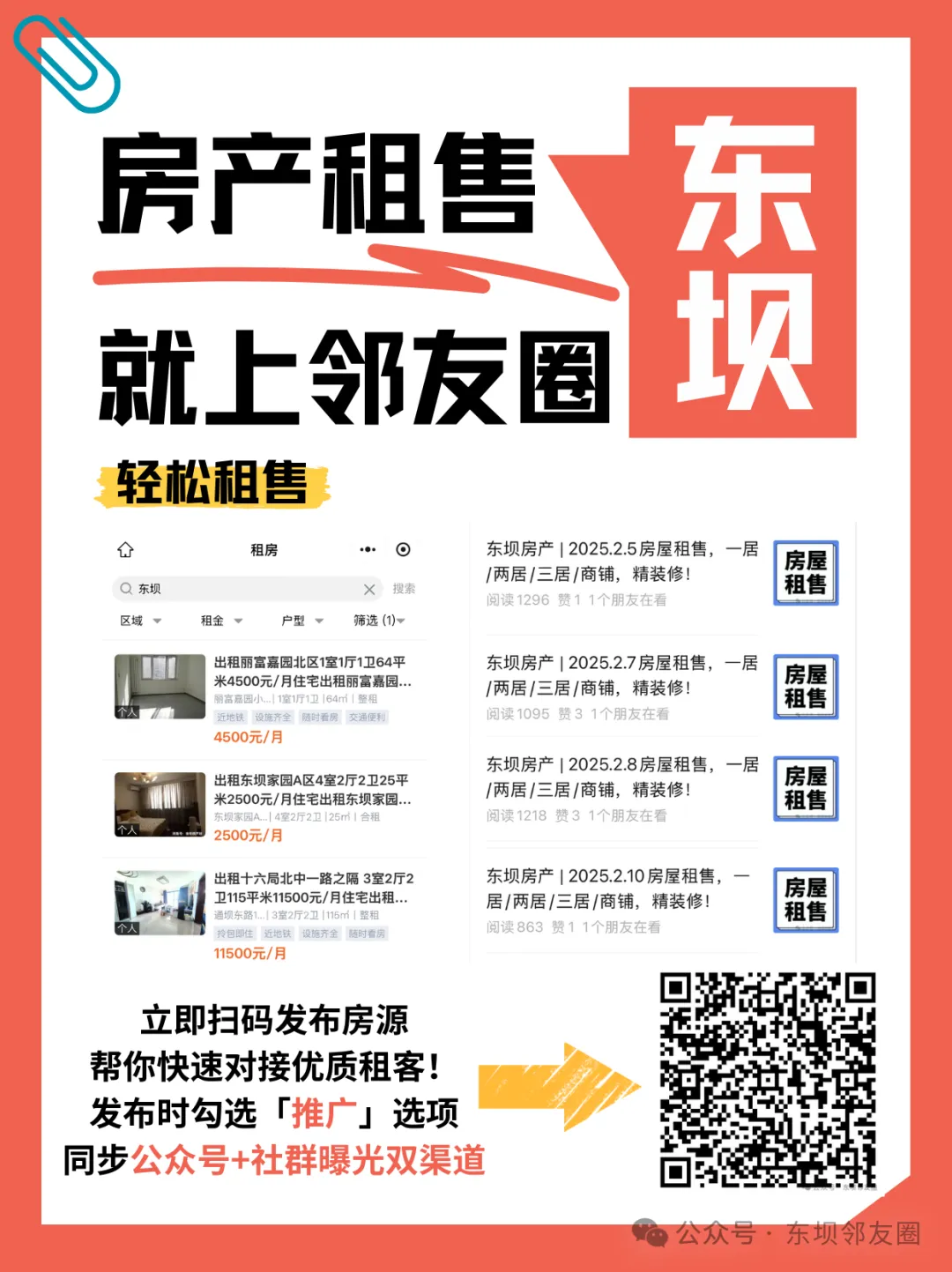 因此,请各位有房源、要出租房子的东坝房主快快扫描下方二维码或登录邻友圈App,在房产版块发布您的房源信息,除了能在北京百万居民使用的社区平台邻友圈上展示外,选择推广,小编还可以在东坝邻友圈公众号以及几十个东坝社群转发,帮大家快速出租房子!(各大应用市场或苹果AppStore搜索“邻友圈”即可下载邻友圈App,也可以在微信小程序里搜索“邻友圈房产”,在小程序里直接发布您的房源)温馨提示:信息来源于邻友圈房产租房板块,请求租者自行联系出租人士核实,涉及金钱交易请提高警惕,谨防受骗。