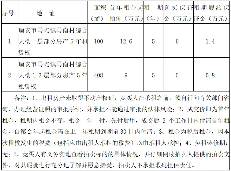 瑞安市马屿镇马南村综合大楼部分房产租赁权拍卖预公告