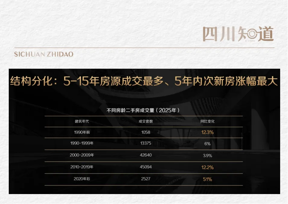 数据显示:90-144㎡是成交主力,5-15年次新房流通性最强,5年内次新房涨幅最大。刚需、刚改、改善客群均能找到适配房源。(数据来源:贝壳研究院四川分院、四川中原)