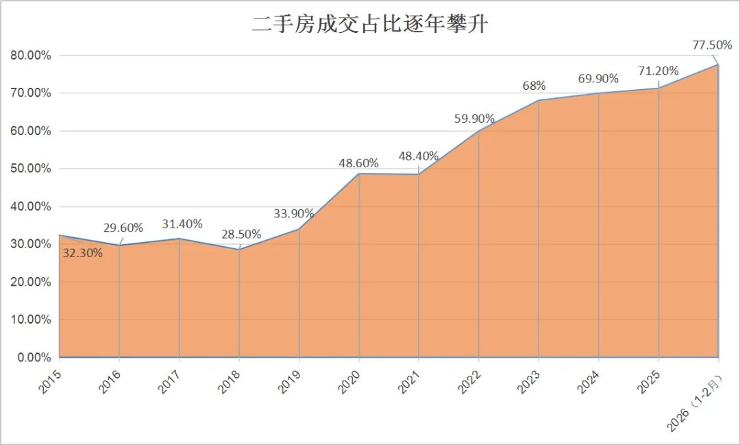 2026年1-2月,二手房成交占比继续攀升达77.5%——占比近八成!预计今年大概率将突破80%。