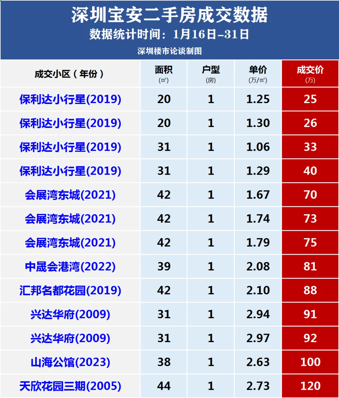深圳2026年1月16日-31日二手房成交数据汇总