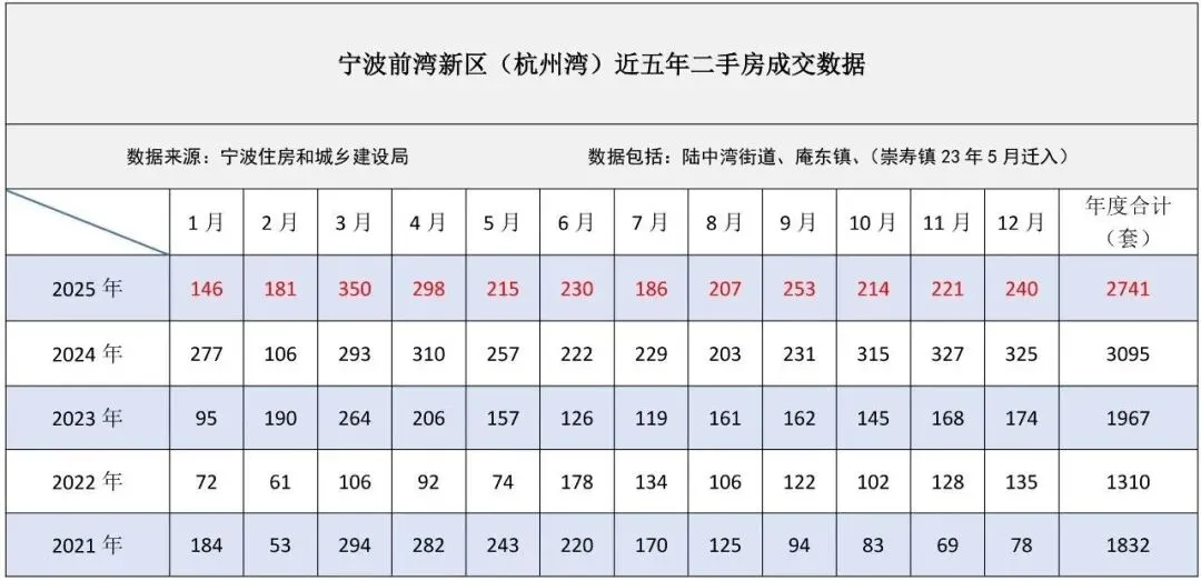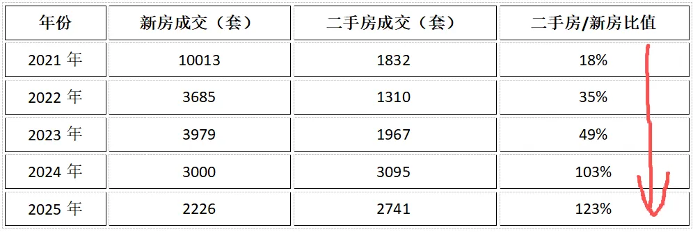 2025年的前湾新区楼市,悄悄完成了一场“主角切换”——全年二手房成交2741套,反超新房的2226套,成为市场绝对主力。而在5年前的2021年,这里还是新房的“狂欢场”:当年新房成交10013套,二手房仅1832套,新房成交量是二手房的5倍多。从“新房独大”到“二手房主导”,这场转变的背后,是前湾新区从“投资新区”向“生活新城”的本质蜕变——房子不再是“炒作的工具”,而是“生活的容器”;市场不再看“未来的饼”,而是拼“现在的饭”。数据说话:二手房反超新房,是“居住需求”的胜利