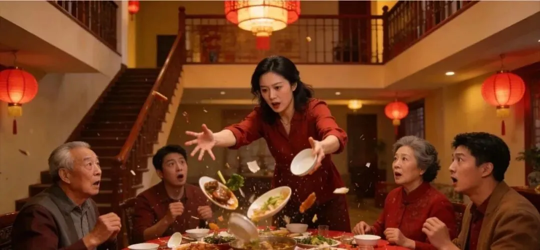 围着她花13000块买的实木餐桌。吃着她从昨天凌晨4点就开始备菜、忙活了整整30个小时做出来的年夜饭。