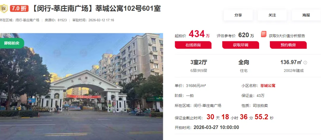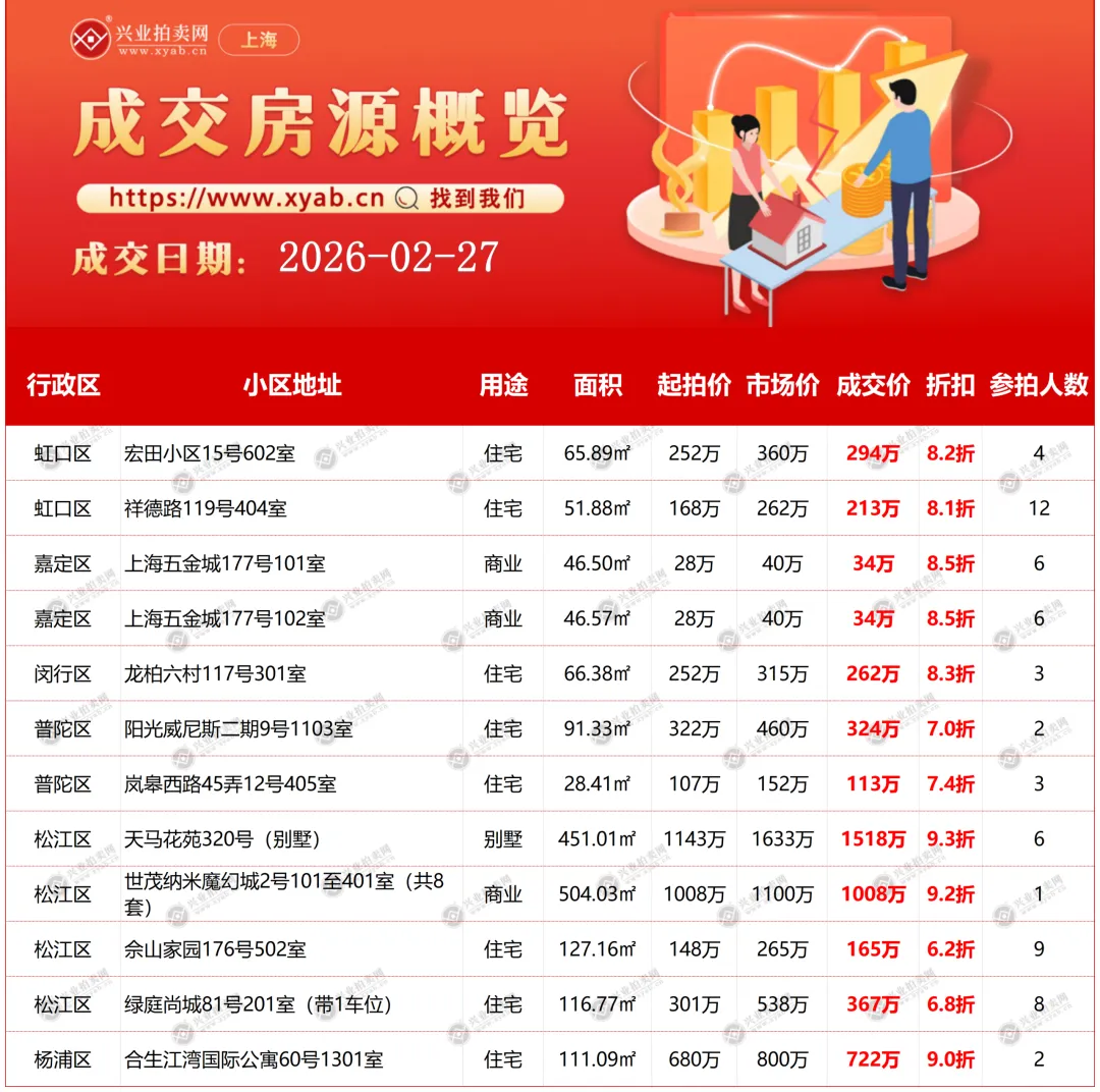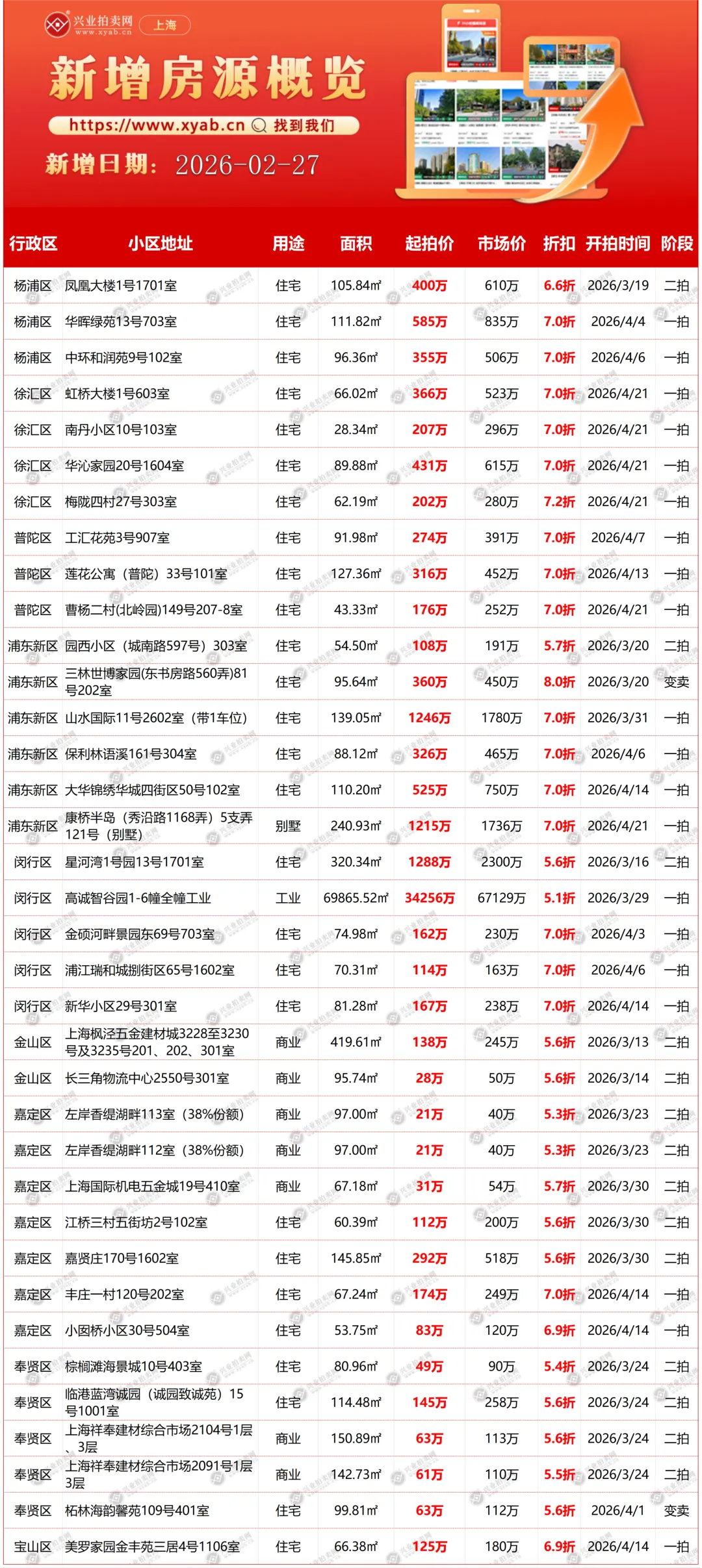 兴业拍卖|2月28日上海拍卖房产简报:新增36套,莘城公寓7折上拍!