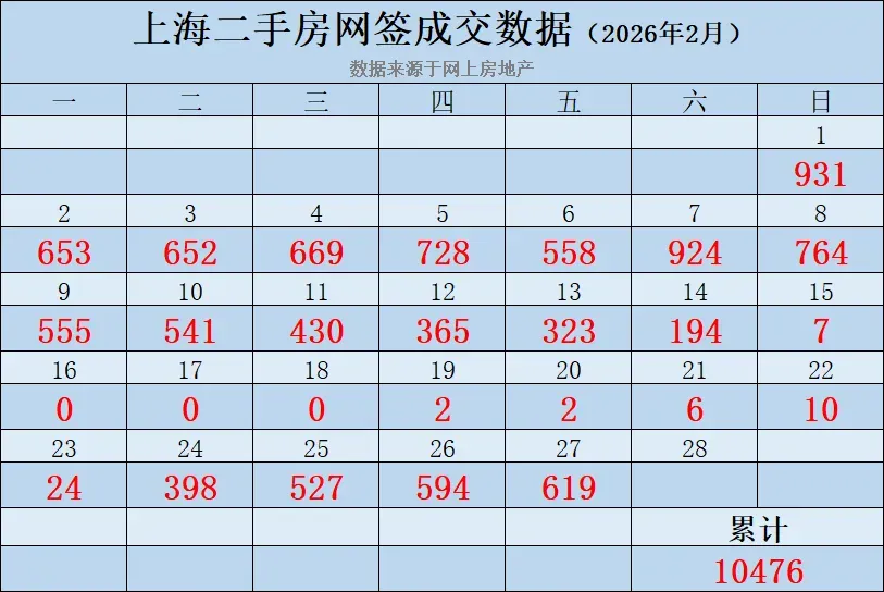 2026年2月上海二手房成交统计:(数据来源网上房地产)