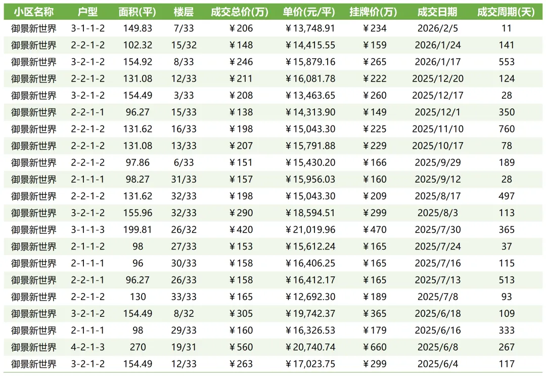 御景新世界近期二手房成交房价统计2026.2.28更新