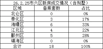 2026年2月25日宁波市六区新房共成交18套,分别为北仑区成交0套,奉化区成交3套,海曙区成交6套,江北区成交4套,鄞州区成交5套,镇海区成交0套
