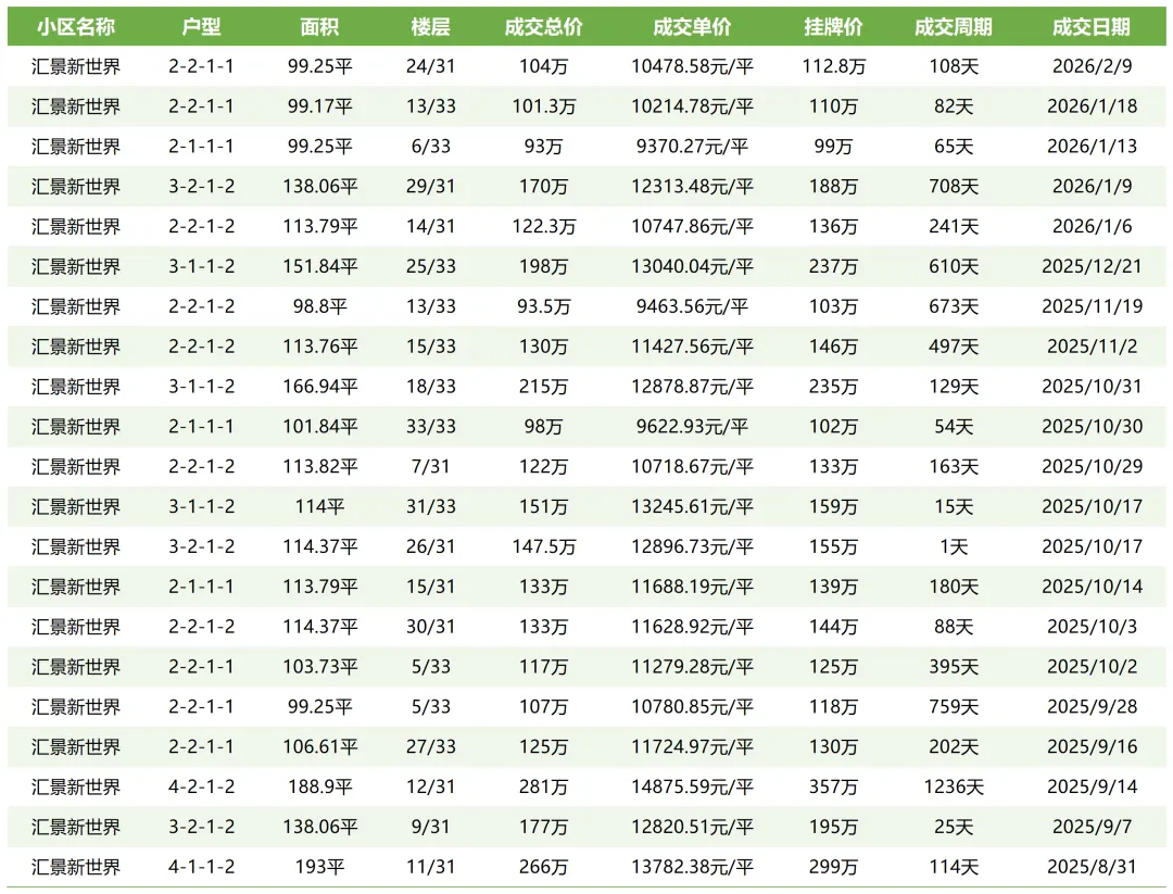 >汇景新世界二手房成交房价统计2026.2.28更新