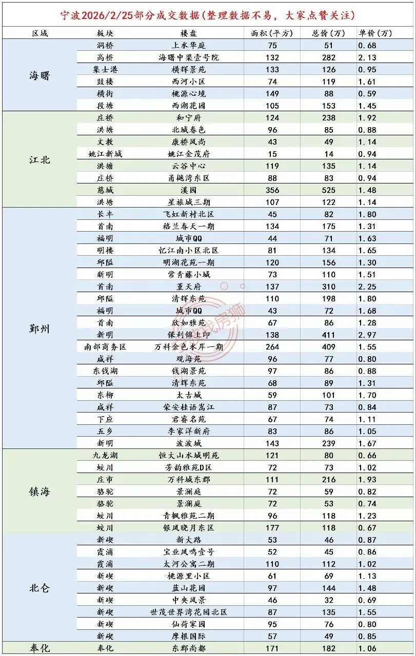 >2月25日宁波二手房成交价格