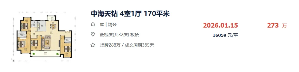 赣州章江新区中海天钻豪宅小区,终于迎来首套房成交!近日,小编浏览二手房平台时发现,赣州章江新区中海天钻豪宅小区迎来首套房成交,作为曾经冻资百万才能买房的豪宅小区,此次首套成交的价格、周期及房源细节,都颇具看点,一起来看看具体情况。此次成交的房源,为建筑面积约170㎡的四房两厅户型,位于小区32层高层的低楼层,楼层位置相对一般。不过从房源详情来看,室内为精装交付,软装均采用进口环保材质,房屋保养状况极佳,基本可以实现拎包入住,省去了后期装修的麻烦。这套房源于2025年1月16日正式挂牌,首次挂牌总价高达369万元,此后经过3次调价,期间带看149次,最终以总价273万元成交,成交单价16059元/㎡。值得注意的是,该房源成交周期较长,花了一年时间最终得以成交。
