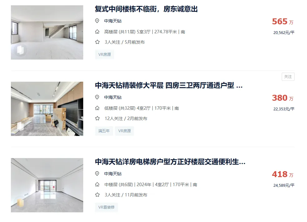 随后于2024年12月底迎来交房,迈入二手房市场。目前挂牌均价21537元/㎡,仅挂出9套房源,近90天成交1套,也就是文中开头提到的房源,近30天带看23次。在这些挂牌房源中,户型涵盖建筑面积约170-274.78㎡四至五房,挂牌单价19182-24589元/㎡,挂牌总价328-565万元。仅有一套房源挂牌单价1.9万+/㎡,其余房源均在2万+/㎡,这样的价格在整个章江新区来看,算是比较高的了。 赣州中海天钻位于钨都大道与兴国路交汇处,地处于章江新区优越地理位置,但就近范围内面貌较为一般。周边临近是章贡中学赞贤路小区,章江路小学北校区、赣三中等教育资源,附近还有章江游泳馆、市民中心、赣州市妇幼保健等配套,另外距离万象城、君尚购物中心等商圈也不远,生活十分便利。首先,中海天钻本身的高端定位,直接拉高了置业门槛。作为纯改善大平层产品,多数业主为自己居住,本身挂牌房源量不多,户型起步面积偏大、总价段较高,再加上开盘定价处于区域高位,天然就过滤掉普通改善客群。其次,周边中海天樾新规洋房入市后,凭借更新的户型设计、更高得房率、更友好的开盘价格,在市场上销售情况较好。对于追求实用性与性价比的买家来说,天樾在居住体验与价格上更具吸引力,直接分走了一部分高端产品的客流。多重因素叠加之下,中海天钻在二手房市场表现偏淡,直至交付一年后才迎来首套成交,也就不难理解。在当前赣州高端住宅市场 “新规产品更吃香、性价比优先” 的行情下,又遭遇同品牌更强竞品,导致该房源成交周期较长。—————— END ——————