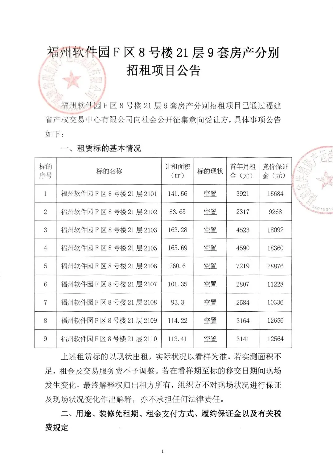 福州软件园F区8号楼21层9套房产分别招租项目公告