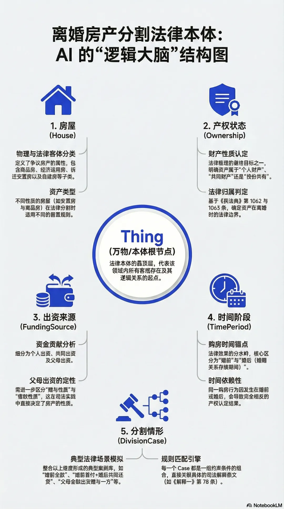 Thing├── Person(人)│ ├── Spouse(配偶)│ │ ├── Husband(丈夫)│ │ └── Wife(妻子)│ └── Parent(父母)│ ├── HusbandParent(男方父母)│ └── WifeParent(女方父母)├── House(房屋)│ ├── CommercialHouse(商品房)│ ├── AffordableHouse(经济适用房)│ ├── RelocationHouse(拆迁安置房)│ └── SelfBuiltHouse(自建房)├── Ownership(产权状态)│ ├── PersonalProperty(个人财产)│ ├── CommunalProperty(共同财产)│ └── SharedByPortion(按份共有)├── FundingSource(出资来源)│ ├── PersonalFunding(个人出资)│ ├── JointFunding(共同出资)│ └── ParentalFunding(父母出资)│ ├── GiftFunding(赠与性质)│ └── LoanFunding(借款性质)├── PurchaseMethod(购房方式)│ ├── FullPayment(全款购买)│ └── MortgagePurchase(贷款购买)│ ├── CommercialMortgage(商业贷款)│ ├── HousingFundLoan(公积金贷款)│ └── CombinedLoan(组合贷款)├── TimePeriod(时间阶段)│ ├── PreMarriage(婚前)│ ├── DuringMarriage(婚姻存续期间)│ └── Separation(分居期间)├── Registration(产权登记)│ ├── RegisteredToOne(登记在一方名下)│ └── RegisteredToBoth(登记在双方名下)├── DivisionMethod(分割方式)│ ├── AwardToOne(归一方所有+补偿)│ ├── SellAndDivide(变卖后分割)│ ├── BiddingAcquisition(竞价取得)│ └── ContinuedCoOwnership(继续共有)├── DivisionCase(分割情形)│ ├── PreMarriageFullPayment(婚前全款)│ ├── PreMarriageMortgage(婚前贷款婚后还贷)│ ├── JointPurchase(婚后共同购买)│ ├── ParentalFullFunding(父母全额出资)│ └── InheritedHouse(继承/受赠房产)└── LegalBasis(法律依据) ├── CivilCodeArticle(民法典条文) └── JudicialInterpretation(司法解释条文)