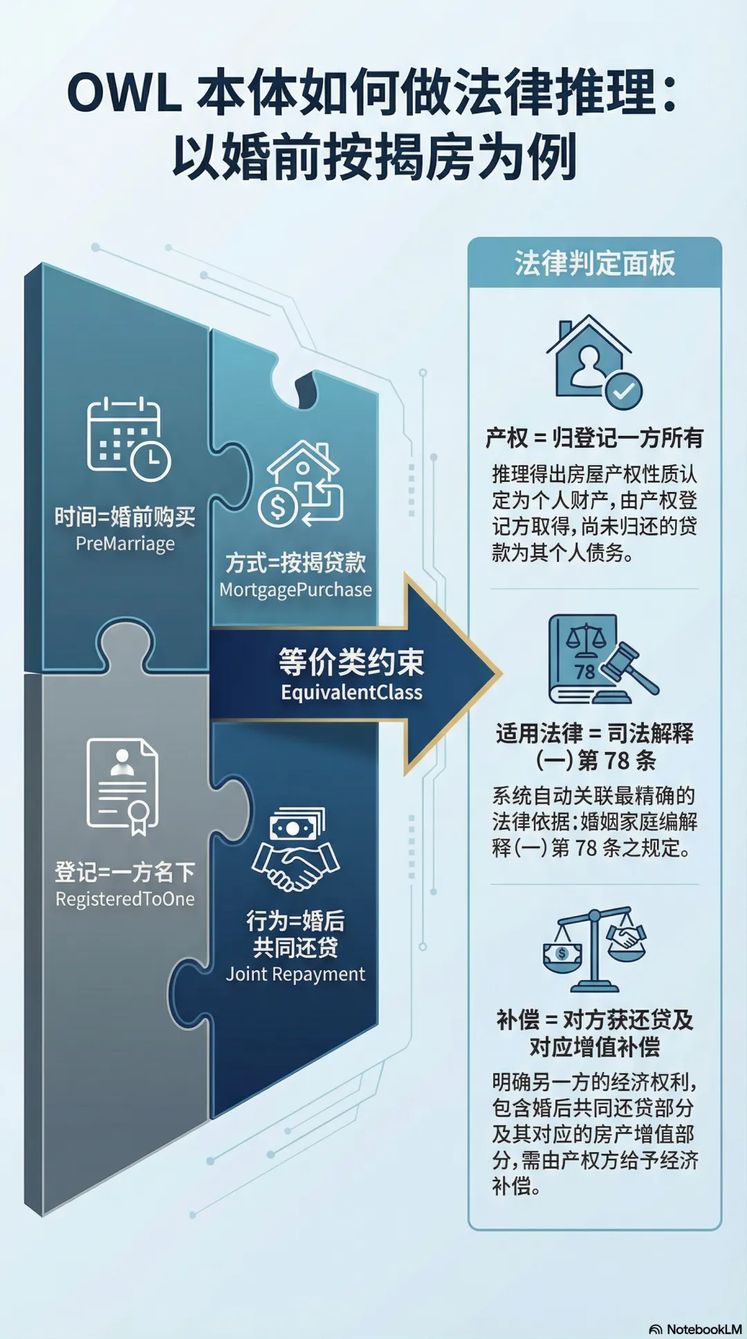 这段 OWL 代码的意思是:如果一个分割情形满足"婚前购买 + 贷款 + 登记在一方名下 + 存在婚后还贷"四个条件,它就是 PreMarriageMortgage 类的实例。分割方式为"归一方所有+补偿",适用司法解释第 78 条。