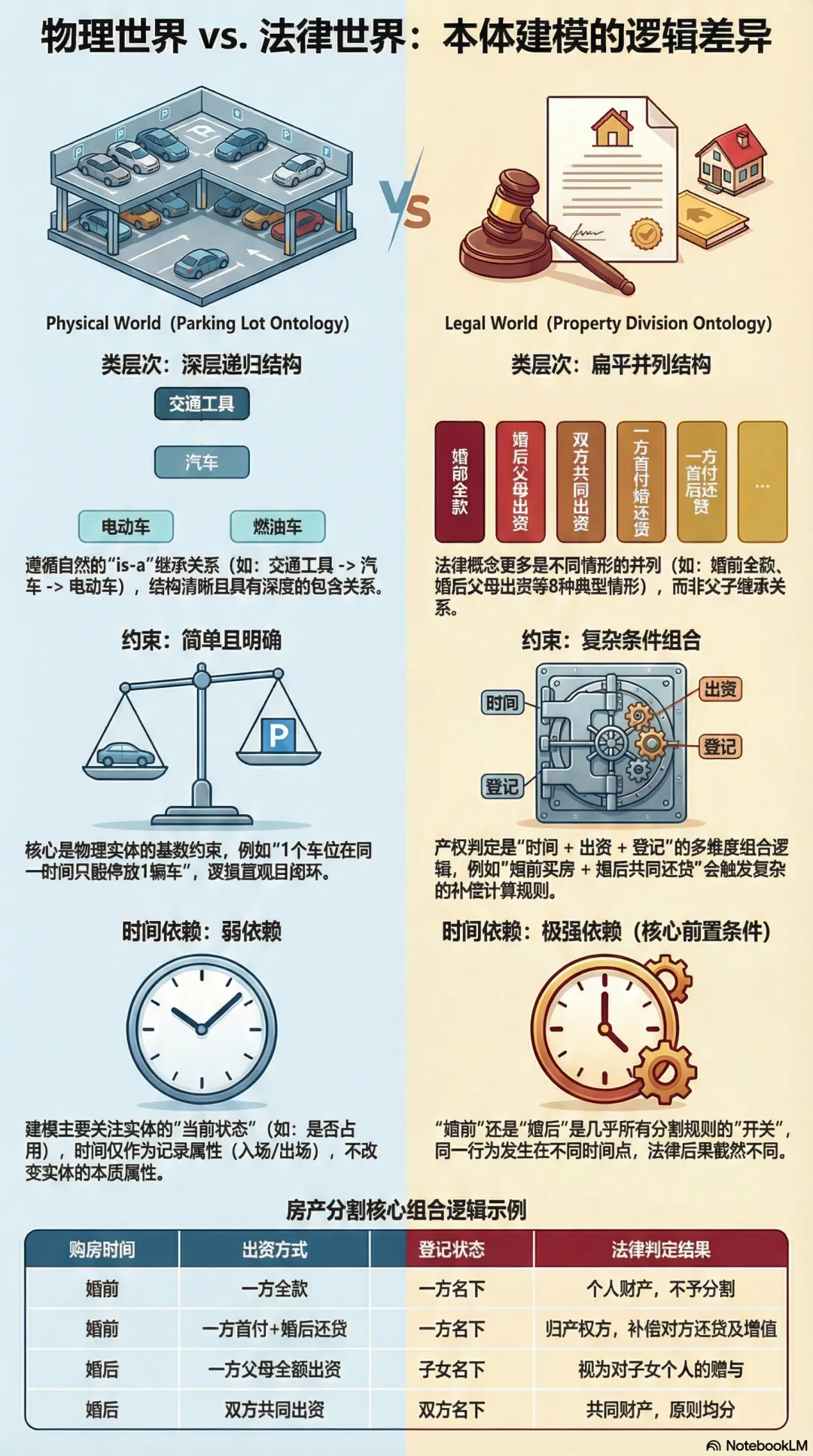 第四,时间是一等公民。停车场本体里,时间只是记录属性(入场时间、出场时间)。离婚房产本体里,时间是核心判断条件——同一个行为(买房),发生在婚前和婚后,法律后果完全不同。