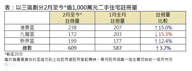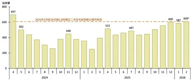 据香港土地注册处资料显示,2月至今(截至26日)二手住宅(包括二手私人住宅及二手公营房屋)录4,135宗注册,仍较1月4,597宗低约10.1%,但逾1,000万元二手住宅2月至今录609宗注册,已率先超越1月587宗约3.7%,并创22个月新高(图)。鉴于签署买卖合约至递交到土地注册处注册登记需时,2月注册个案一般主要反映1月市况。