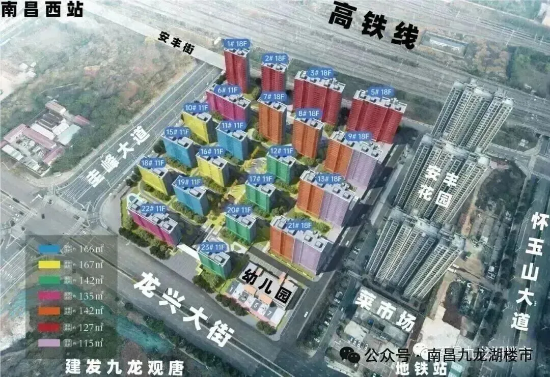 建发九龙观唐,旁边就是地铁四号线怀玉山大道站,地铁二号线和四号线的西站南广场站也不远,首开地块一期(A 0 4 地块)占地80.4亩,由6栋15F-17F小高层和10栋24F-26F-27F高层,共计1122户,车位1660辆,小区设有多处水景,和一所幼儿园,一楼设有架空层,容积率2.7,绿地率30%,建筑密度18.9% ,高层 95平,108平,118平,128平三室两厅二卫,143平四室两厅二卫,小高层 137平四室两厅二卫,168平四室两厅三卫 ,全部精装修交付,全系带中央空调,小高层带地暖和新风和洗碗机,物业费3.4元 。