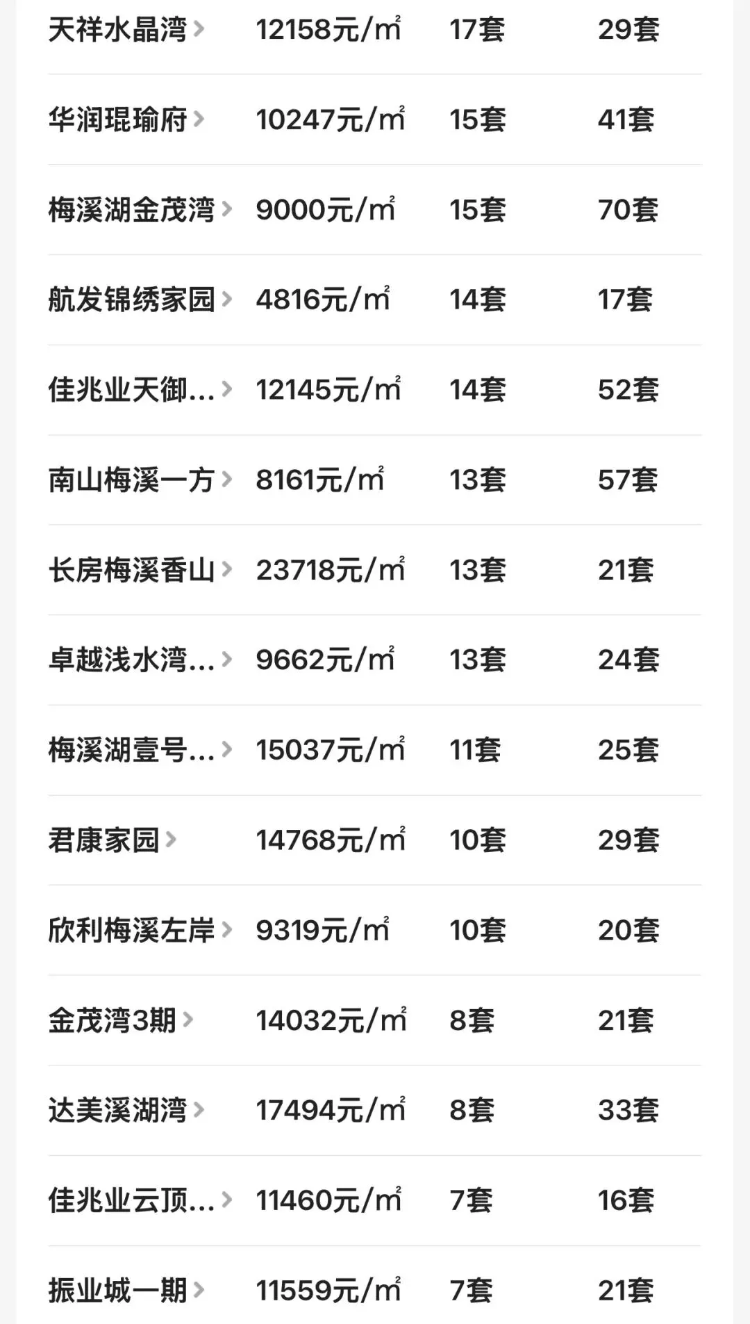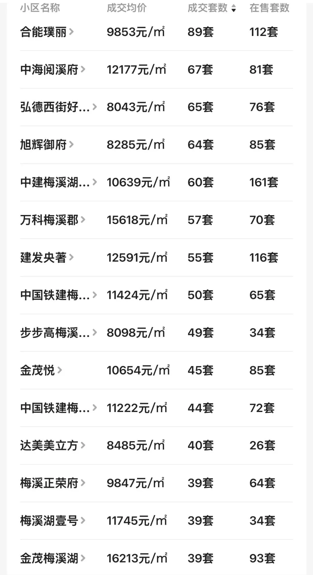 虽然现在长沙的学校越来越多,竞争越来越大,但是梅溪湖的教育资源依然保持整体优质和均衡。比如:第一梯队的师大附中梅溪湖中学(四大率15%左右,公办普高率75%左右);还有好几所位列第二梯队上游的学校,比如:长郡梅溪湖中学,周南梅溪湖中学、一中岳麓、西雅中学、附中博才梅溪湖中学等。它们的四大率在5%-10%之间,公办普高率60%-70%左右,皆在平均水平之上。如果按四大指标生分数排名(约等于四大率排名),长沙180多所初中里,梅溪湖一期的6所学校全部能够排进前35名,属于全市初中1/5序列,没有弱校。最重要的是,梅溪湖的学校基本没有放肆掐尖,主要靠的是地段内的楼盘配套生+微机派位生考出的好成绩。甚至长郡梅溪湖这种学校,连所谓的"重点班"据说都不存在~对于了解实情的家长来说,梅溪湖学校的诱惑力着实有点大。再加上梅溪湖绝大部分房子都有对应的小学+初中双学位,一箭双雕,省心省力。当然,梅溪湖六所学校中,目前最受欢迎的当属师大附中梅溪湖中学,长郡梅溪湖中学紧随其后。据我们观察:有些经济条件好的梅溪湖一期业主,当孩子要读书的时候,很可能会在梅溪湖南岸二次置业,给孩子买一套师大附中梅溪湖中学的房子读书。有优质教育资源加持,叠加价格回调,梅溪湖的二手房卖得十分火热。从某壳APP上数据来看,近一年梅溪湖的二手房总成交量非常大。比如:近一年内,合能璞丽卖了89套,中海阅溪府卖了67套,旭辉御府卖了64套、万科梅溪郡57套、建发央著50套......