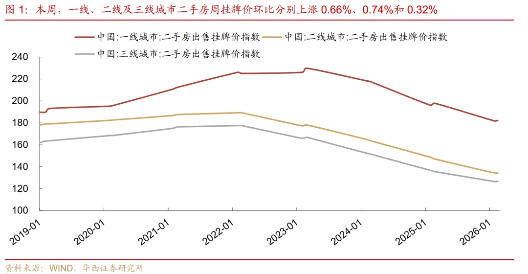 我们主要观察二手房价,因新房价格受推盘区域影响,波动往往较大。本周更新的是Wind披露的二手房出售挂牌价指数(周度)。