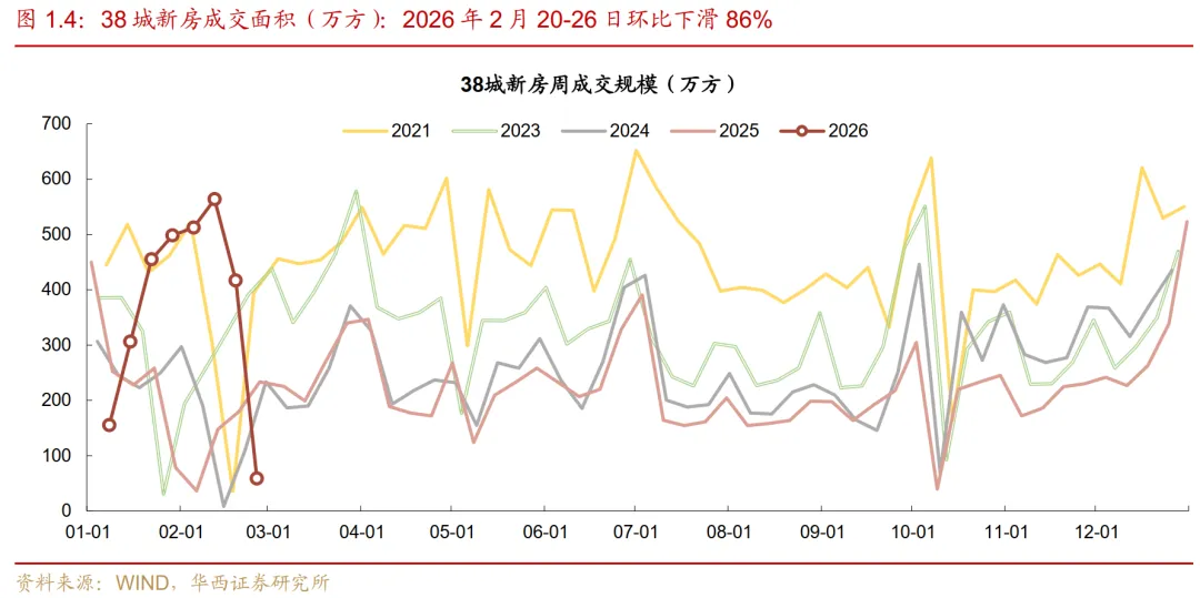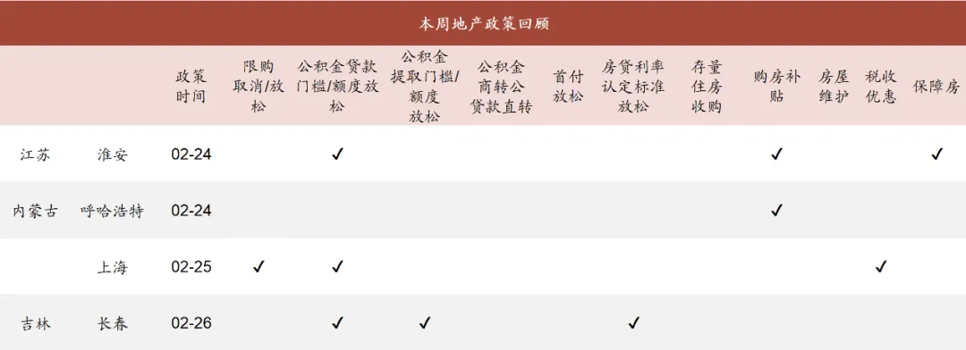 注:由于本周(2月20-26日)包含四个春节假期日,成交数据受季节性因素影响普遍偏低且存在较多缺失。本周内容聚焦于房价边际变化及上海楼市新政。春节期间地产成交详情详见《春节假期不能错过的事》。