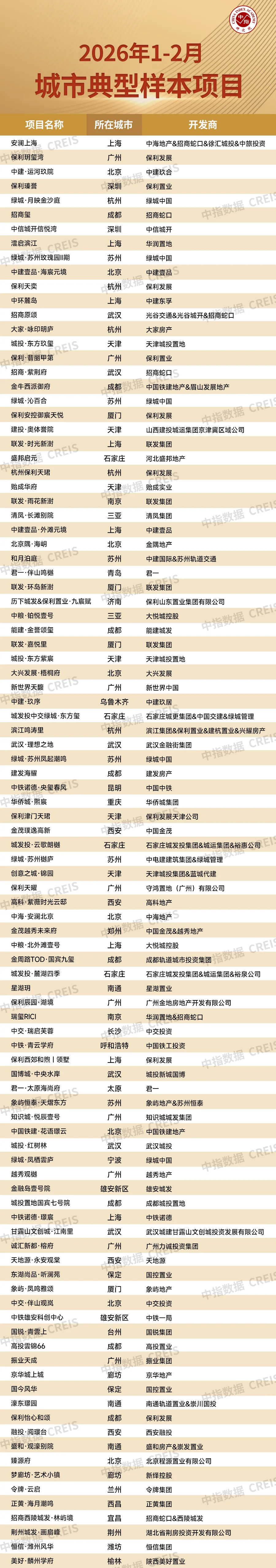 截至2月,全国31个省市两会均已落幕,从各地对房地产工作的部署来看,建设“好房子”已成为一项重要任务。此外,多省市对于“好房子”的表述由2025年的“大力推动”转变为“有序推进”,2026年预计相关工作将平稳推进。在此背景下,中指研究院在中房指数系统理论体系和架构的基础上,从百城价格指数样本项目中选取城市中有较强知名度和广泛影响力的项目,以“典型性”为基本原则,从销售表现、项目品质、品牌实力等维度出发,对主要城市样本项目进行研究,得出“2026年1-2月城市典型样本项目”,为行业提供标杆典范。