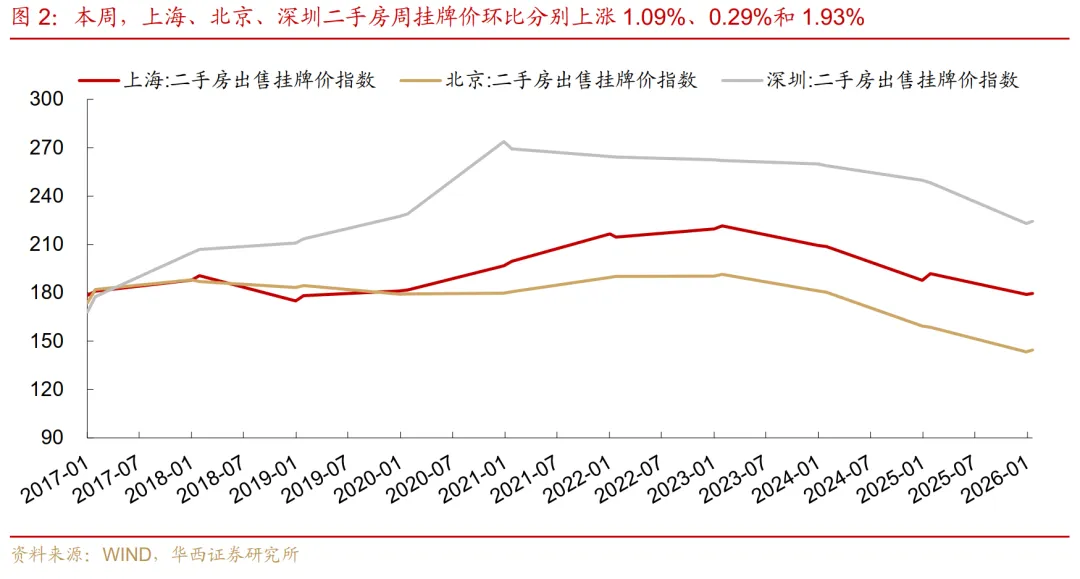 华西证券通过跟踪体系发现,二手房挂牌价在本周呈现普遍回升态势。由于二手房价格受推盘区域影响较小,更能反映市场真实温度。