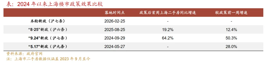 社保门槛大降:非沪籍家庭及单身人士在“外环内”购房的社保或个税缴纳年限,由3年大幅缩短至1年。套数限制放宽:非沪籍在外环内缴满3年社保,即可购买2套住房,打破了此前仅限1套的限制。华西证券指出,梳理2024年以来的政策脉络,上海限购放松呈现出“由外至内”的特征。此次“沪七条”正式触及核心城区,政策力度增强,释放了更为积极的托底信号。参考2024年“924”政策落地后上海二手房成交同比曾冲高至64.2%的历史经验,此次直指核心地段的政策有望更强力地引导改善型需求和市场信心。华西证券研报认为,2026年作为房地产市场“止跌回稳”的关键节点,上海此次针对内环政策的突破具有重要的风向标意义。这不仅体现了调控的精准性,也预示着后续其他一线城市可能陆续跟进,针对核心城区的限购政策有望迎来进一步的优化空间。