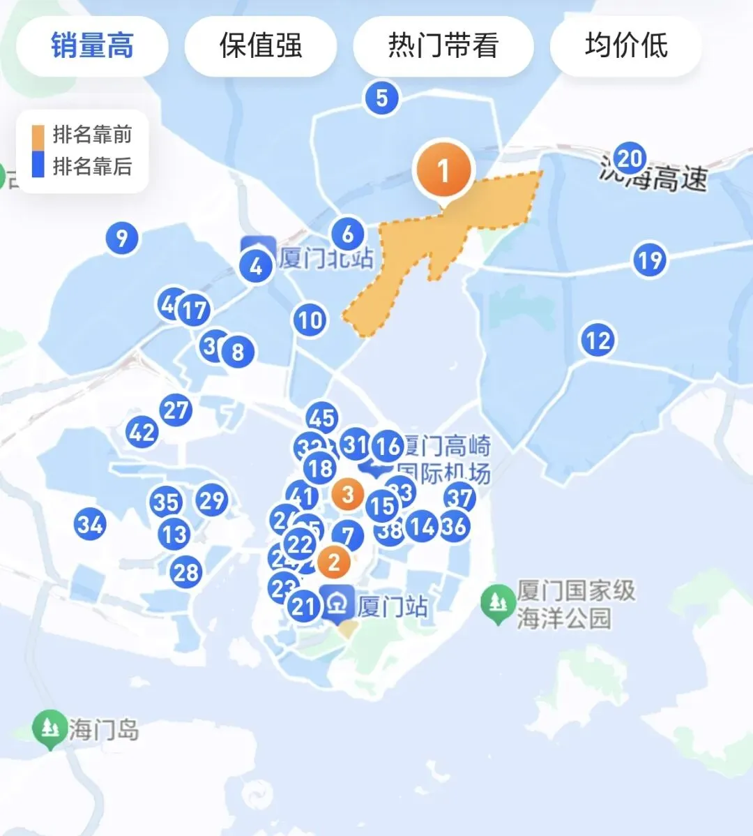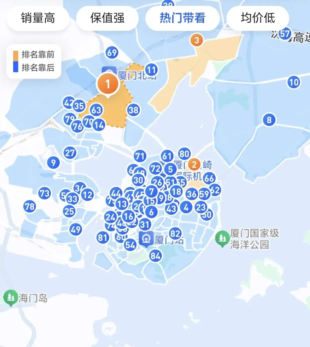 (2)厦门“近7日热门带看”前三版块分别是:第一,集美新城(150人);第二,五缘湾(134人);第三,环东海域(131人)。