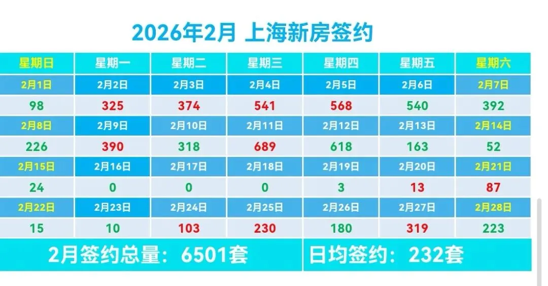 🏠2月上海新房总签约6501套,日均签约232套,本月签约总面积53.3万m²,套均面积90.5m²。