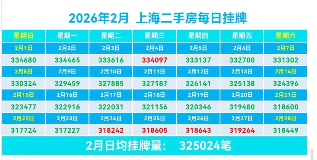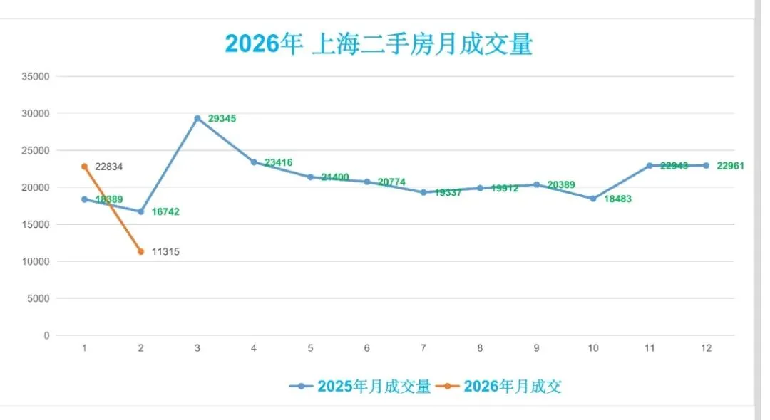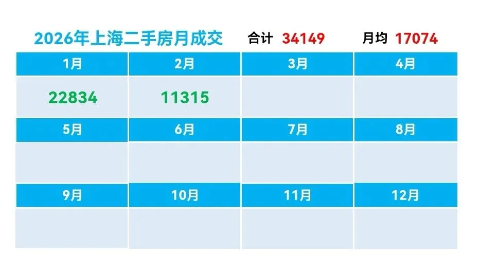 ♻️截止2026年2月28日,2026年上海二手房成交量合计34149套,月均21174套。