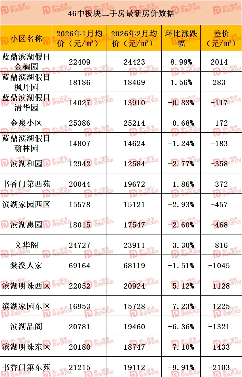 涨幅最高的蓝鼎滨湖假日金榈园,涨了2014元/㎡。