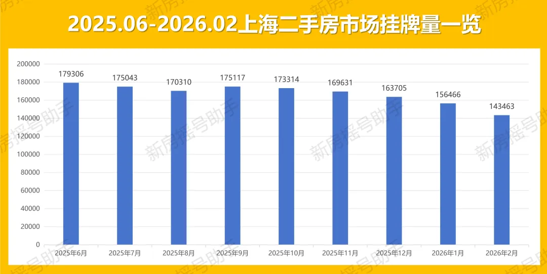 看完了成交数据,再来看看挂牌量这一关键库存指数。据兔博士数据统计,截至2026年2月28日,上海二手房挂牌量为14.35万套,已连续五个月环比降低。