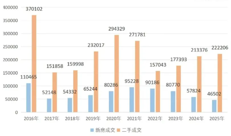 2016-2025年上海新房/二手房成交套数对比