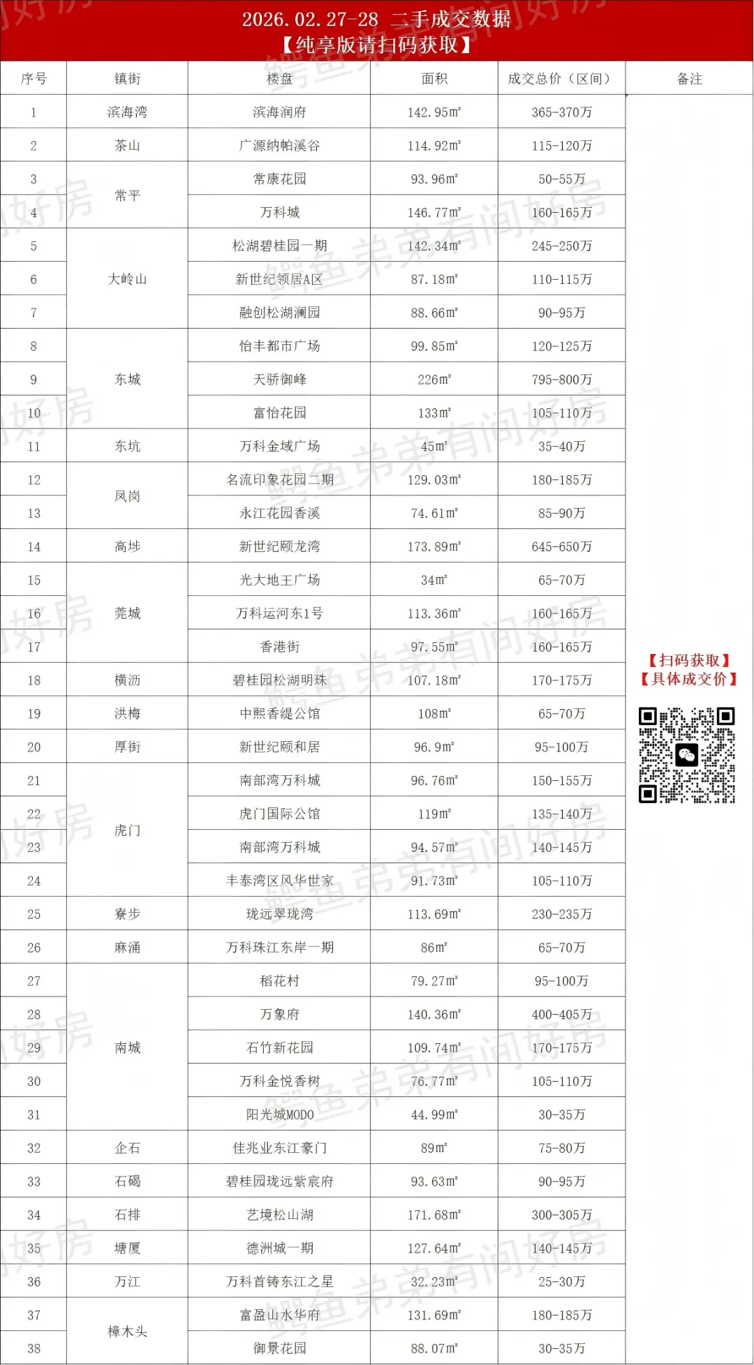 近期因我们统计的真实成交数据,影响到了部分小区的二手交易,受到不少中介同行和业主们的投诉和举报,后续公众号只发成交区间价格,具体的成交总价和单价只发布在我们的粉丝群,有兴趣的朋友请扫码加入。