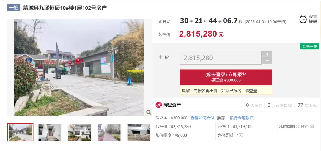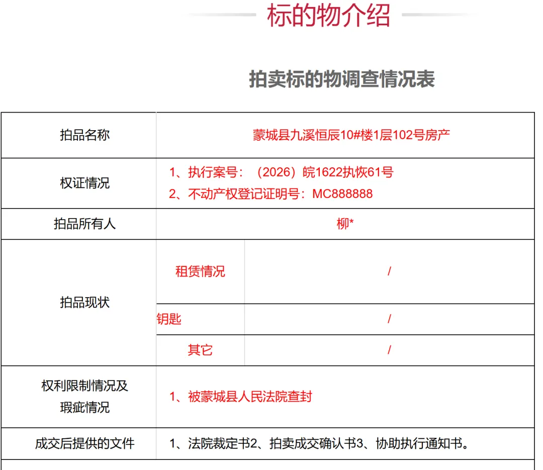 本次拍卖标的物:蒙城县九溪恒辰10#楼1层102号房产,不动产权登记证明号:MC888888,房屋性质:市场化商品房,建筑面积:366.46平方米,(实勘)所在层数/总层数:-2-3F/5F。整体拍卖,评估价格:3519100元,起拍价:2815280元,保证金:300000元,增价幅度:5000元(以及其整倍数)。