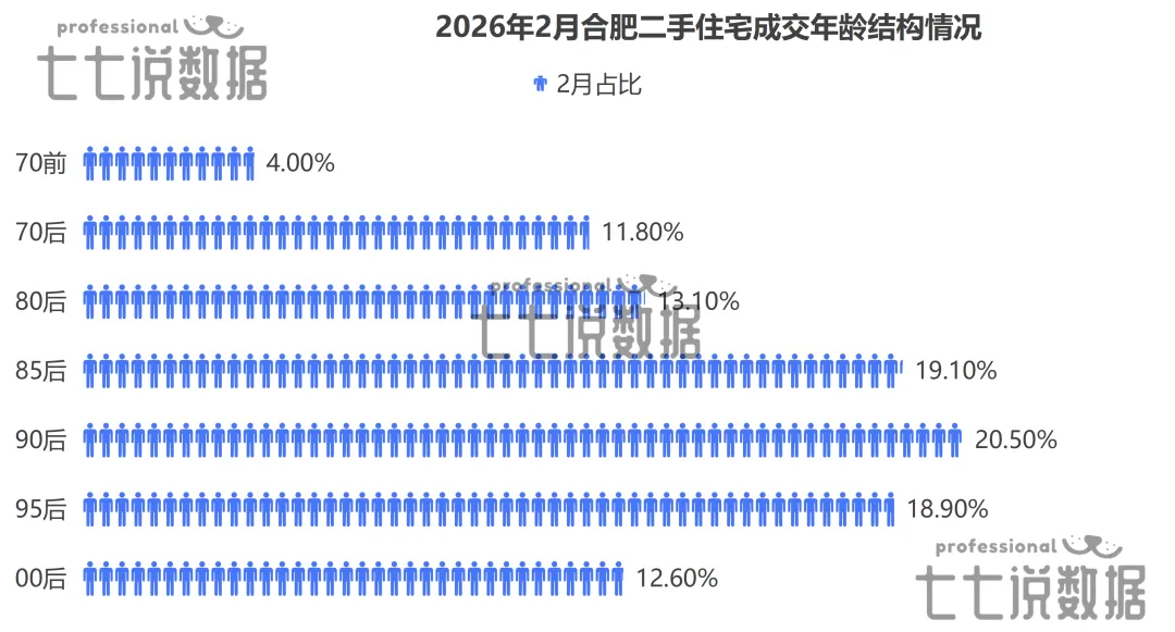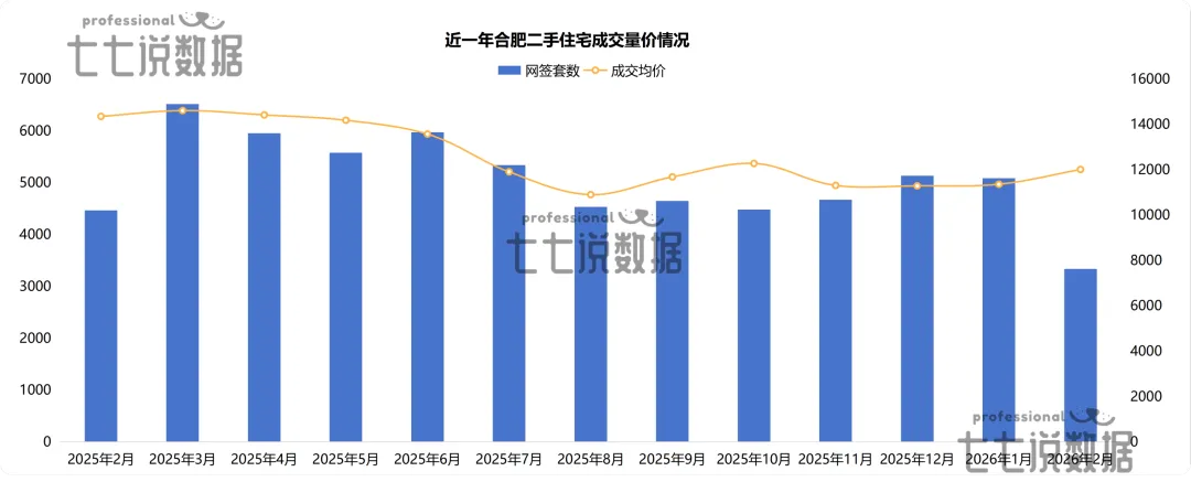 自2025年2月至2026年2月合肥二手住宅的成交均价大致呈现逐步下降趋势,在2月-3月和9月-10月有一个增加迹象,目前成交价成交价较之上月也略有增长。在今年8月成交均价处于近一年来最低价,仅10902元/㎡。