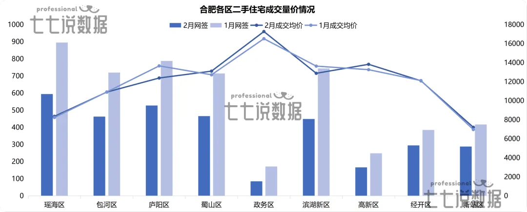 从区域成交情况来看,2月瑶海区在各区中以595套成交量脱颖而出,较1月环比下降33.59%,成交均价达8365元/㎡,环比上升1.47%;政务区则以17278元/㎡的成交均价位列九区第一,与1月相比成交均价环比上升4.56%。