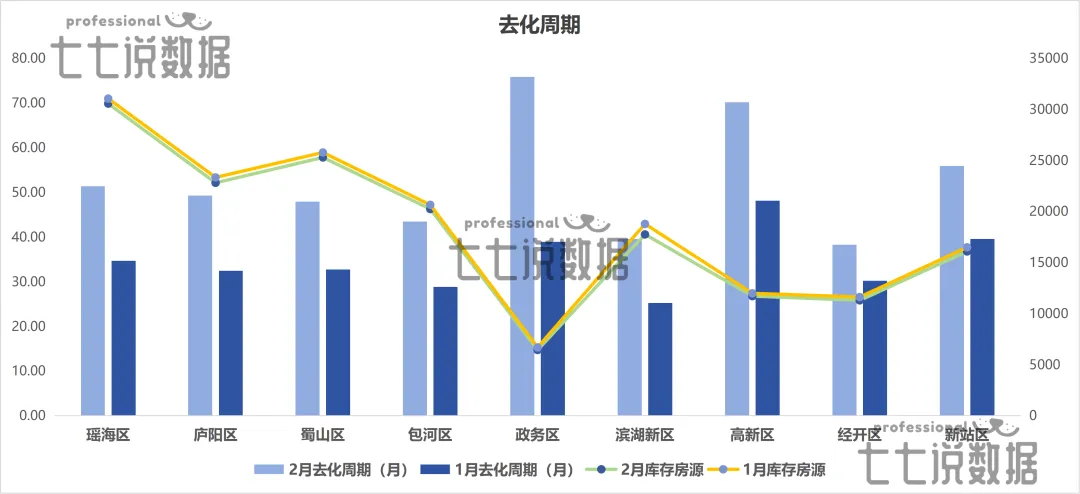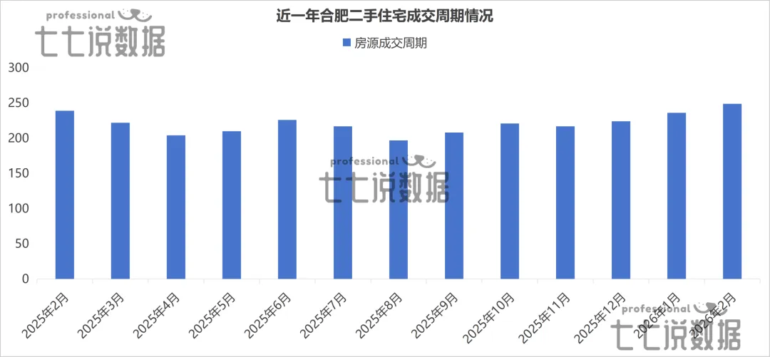 因春节原因,2月区域网签量相较于1月均有所下降。老城区的平均降幅34.28%,新城区平均降幅35.5%。政务区降幅最大约50.58%。在成交均价方面,庐阳区的成交均价较上月有所下降,降幅达9.32%,包河区、庐阳区、经开区也有所下降,其他区域均有所上升,政务区涨幅最大约4.56%。2月合肥二手房库存房源环比下降2.52%。瑶海区2月库存房源超过30000套(也是唯一一个)位于九区第一。九区的平均去化周期为52.43个月,较1月来看环比上升51.78%。政务区的时间最长为75.85个月,经开区时间最短为38.32个月左右。因春节原因,合肥区域去化周期较上月有所上升,政务区的去化周期上升幅度最大,环比上升94.71%。从成交周期来看,2月的房源平均成交周期为249天,相对于1月来说增加13天,环比上升5.51%,同比上升4.18%。近一年中成交周期最短的是今年8月197天,最长的是今年2月249天。