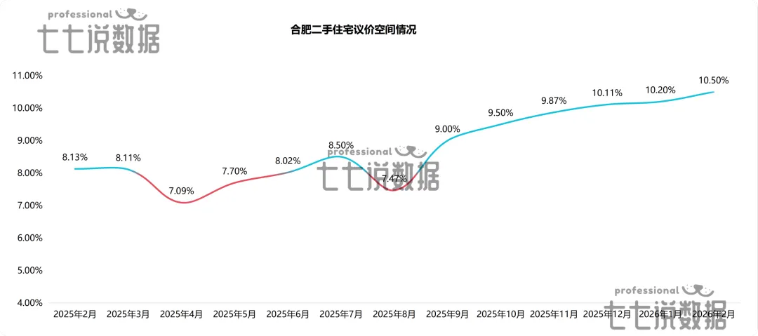 议价方面,从2025年2月至2025年3月议价空间一直处于上下小幅度波动的情况,在今年4月极速下降至7.09%,成为近一年来议价空间最小的月份;后在4月-7月一直稳步上涨,8月合肥二手房的成交议价空间稍有下降,下降至7.47%,到9月议价空间又有所回升,回升至9%,后续几月稳步上升,2月议价空间较上月来说环比上升0.3%,相比去年1月同比上升2.37%。近一年的议价平均值为8.78%。
