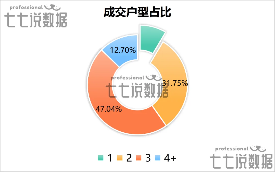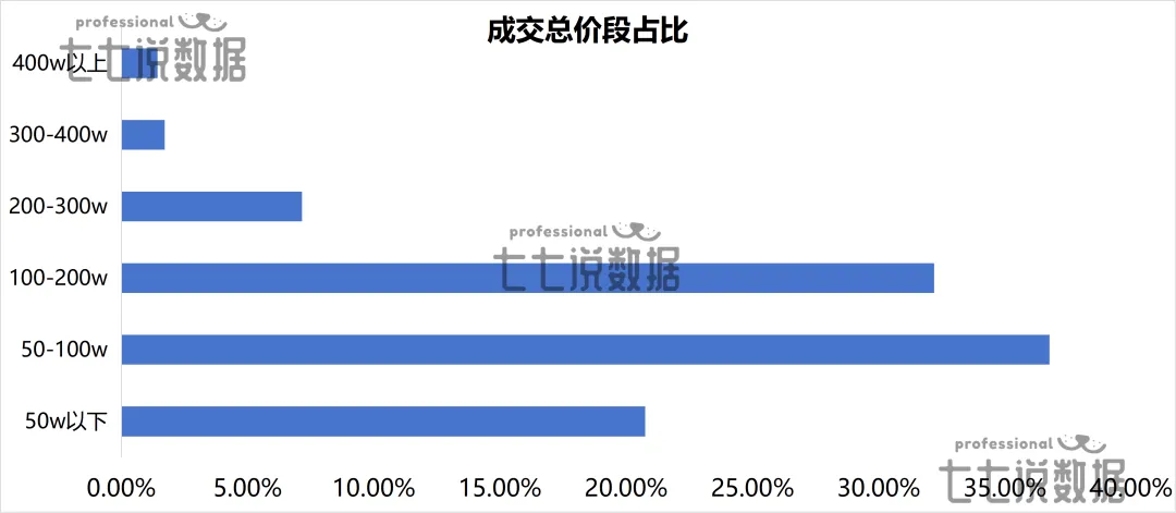 从成交总价段来看,成交价格在50-100万之间的占比最高,占比为36.77%。其次是100-200万,占比为32.19%,400万和300-400万之间以上占比最少,合计仅占3.15%。