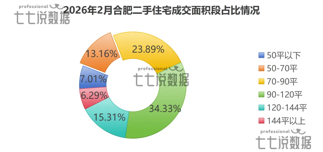 价段对比上,2月成交价格在50万以下的占比与1月相比涨幅最大,上涨了4.4%,而价格在50-100万之间的降幅最大,占比下降了2.3%。从成交面积来看,其中面积在90-120平之间的更受大众欢迎,占比达到34.33%。而70-90平之间的占比仅次于第一,占比为23.89%,面积在144平以上的则较为小众,占比仅6.29%。