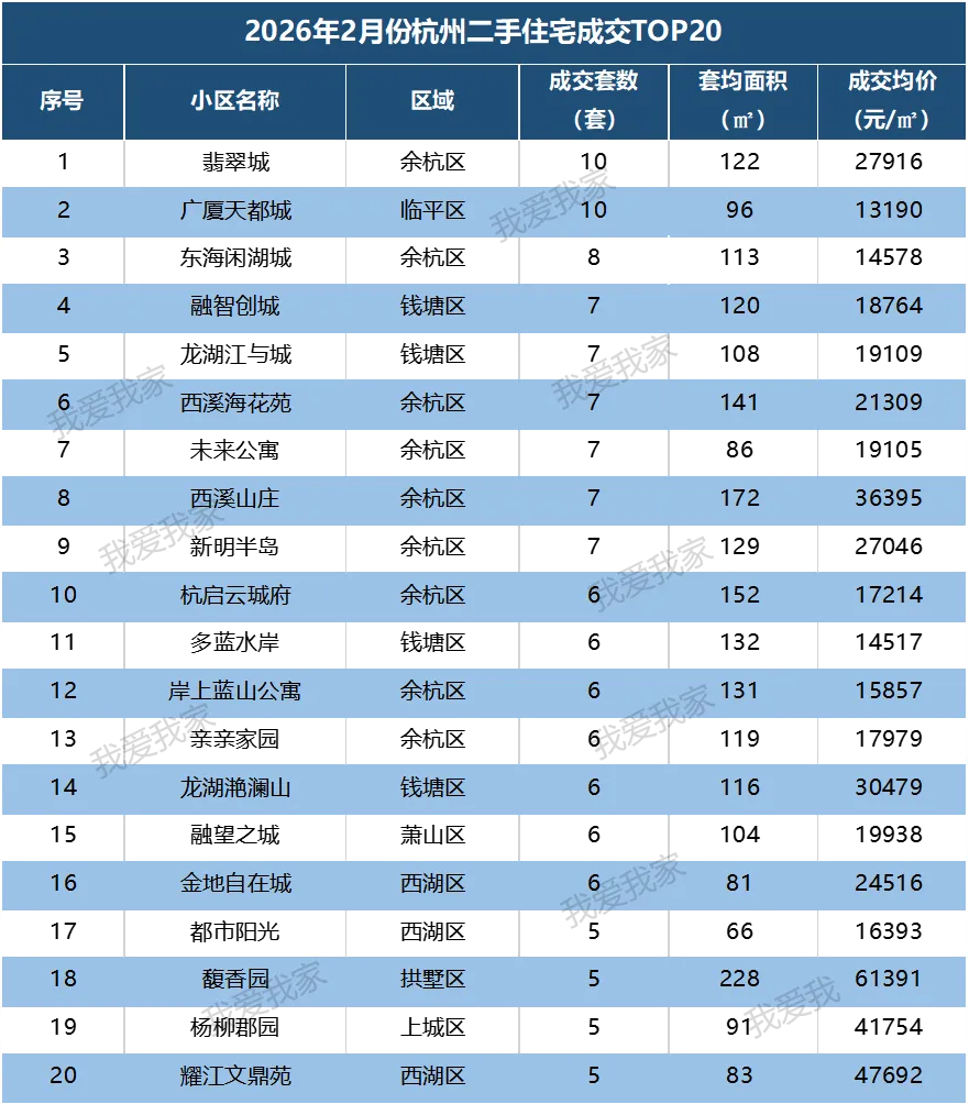 不含临安和富阳,刚需成交量最大的住宅小区是翡翠城和天都城,2月分别签约10套。翡翠城成交均价27916元/㎡,套均面积122㎡;天都城成交均价13190元/㎡,套均面积96㎡。