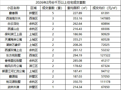 2月杭州总价千万以上成交热门小区